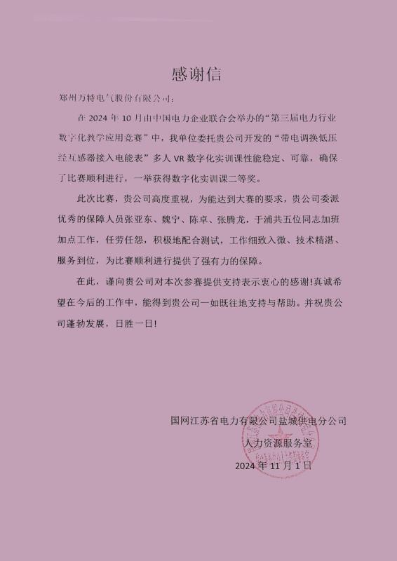 2024年11月1日,公司收到了來自國網(wǎng)江蘇省電力有限公司鹽城供電分公司的感謝信,對公司在“第三屆電力行業(yè)數(shù)字化教學(xué)應(yīng)用競賽”中的卓越貢獻(xiàn)表示高度贊揚和衷心感謝。
