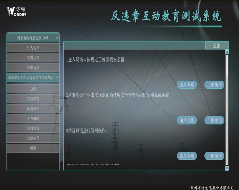 反違章互動測試系統(tǒng)設(shè)計案例依據(jù)國家電網(wǎng)公司編寫的 《國家電網(wǎng)公司安全生產(chǎn)違章100條》,進(jìn)行編制相關(guān) 事故,遵循《國家電網(wǎng)公司電力安全工作規(guī)程》進(jìn)行正 確動畫的制作。反違章互動測試系統(tǒng)運(yùn)用三維動畫等先 進(jìn)開發(fā)技術(shù)逼真還原事故過程、事故現(xiàn)場,突破了傳統(tǒng) 安全教育不能用視頻重現(xiàn)事故過程的缺點(diǎn)。更真實(shí)的展 現(xiàn)違章作業(yè)過程,更直觀的感受到違章作業(yè)后果,更深 刻的理解遵章作業(yè)的重要意義。